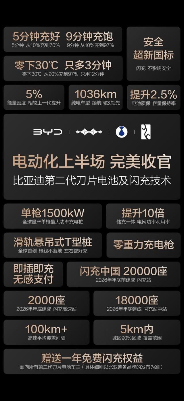 闪充不影响电池寿命,并且相较于第一代刀片电池,第二代产品的使用寿命实现了进一步延长。正是基于对第二代刀片电池性能的绝对信心,比亚迪正式宣布加码电池质保政策:第二代刀片电池的质保“容量保持率”整体提升2.5个百分点,当电池容量衰减至77.5%以下时,即可享受免费包换服务;与此同时,电芯依旧沿用“终身保修”的核心政策。这份承诺,既是比亚迪对产品实力的底气彰显,更是给每一位用户的安心保障——如果闪充真的会损伤电池寿命,又怎能做出如此坚定的质保承诺?