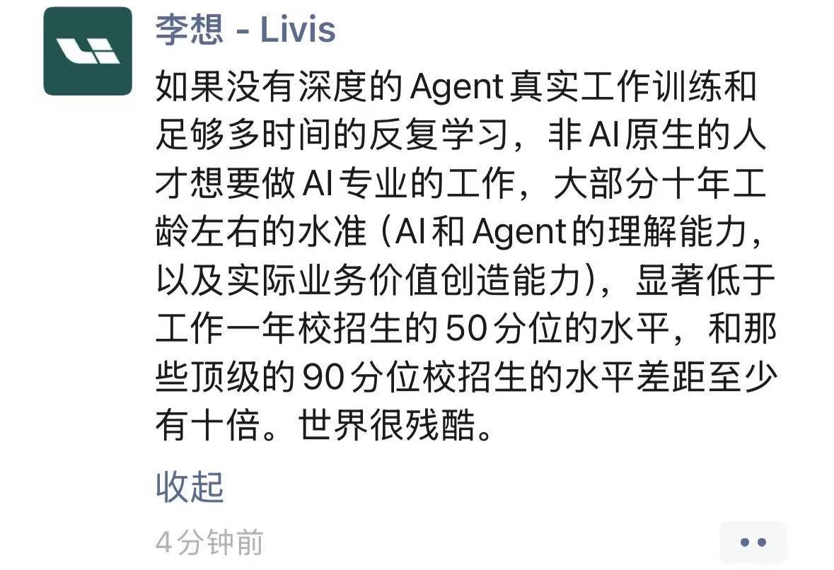 网科技讯 4月15日,理想汽车创始人李想在社交平台发表了一段关于AI人才招聘的观点。李想直言,不要招聘那些非原生或专业AI(每天的工作真正在做模型、Agent等工作的人,或者毕业不是上手就用AI的人)的人才,来公司转型做AI的研发或运营。他将这种行为比作“有金子放在那里不用,非要从矿石里开盲盒提炼金子”。